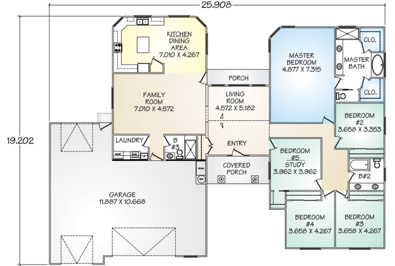 The Avalon panelized kit home boasts an abundance of space. The front entry opens directly into a substantial living room featuring a vaulted ceiling and a respectable view of the back porch and yard through three large windows. Adjoining the living room, the spacious family room offers access to the kitchen and dining room, oversized laundry room, full bath, and garage. A central island and plenty of counter space accentuate the sheer size of the Avalon’s kitchen. The master suite offers a private bath and two separate walk-in closets, while any of the other four bedrooms can easily be modified as a den, home office, or music room. Nine-foot ceilings provide volume to the Avalon. The large three-car garage has ample room for a hobby area or extra storage, and features the ability to drive through to the backyard.