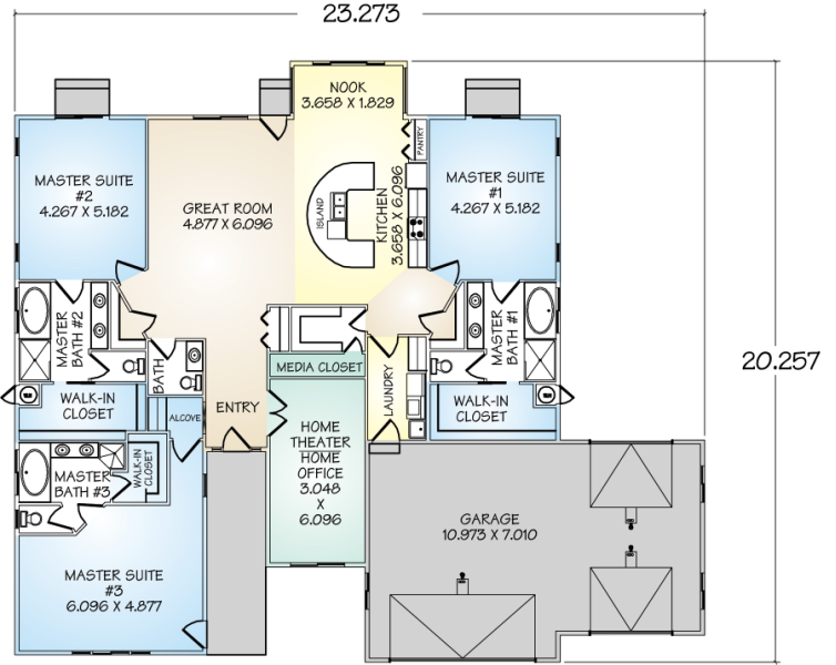 The Montecito panelized kit home is a modern design with multiple master suites branching away from a central dining and entertainment area. Each suite contains a full bath, with generous storage space provided by a walk-in closet. Ten-foot volume ceilings allow a more open feel throughout the house. The plan includes a closed-off media room with a separate closet for wiring and hardware accessibility. The expanded garage features a drive-through and room for multiple vehicles.