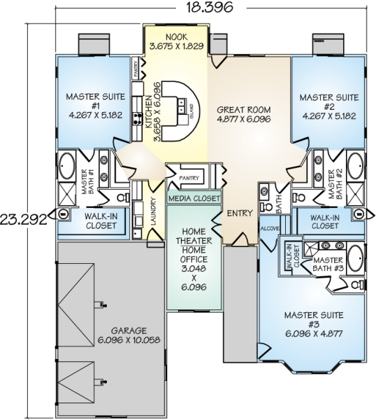 The Murrieta panelized kit home is a modern design that features multiple master suites branching away from a central dining and entertainment space. Each suite contains a full bath, with generous storage space provided by a walk-in closet. Ten-foot volume ceilings allow a more spacious feel throughout the house. The plan includes a self-contained media room with an enclosed closet for wiring and hardware accessibility. The garage showcases a side-entry design with room for multiple vehicles.
