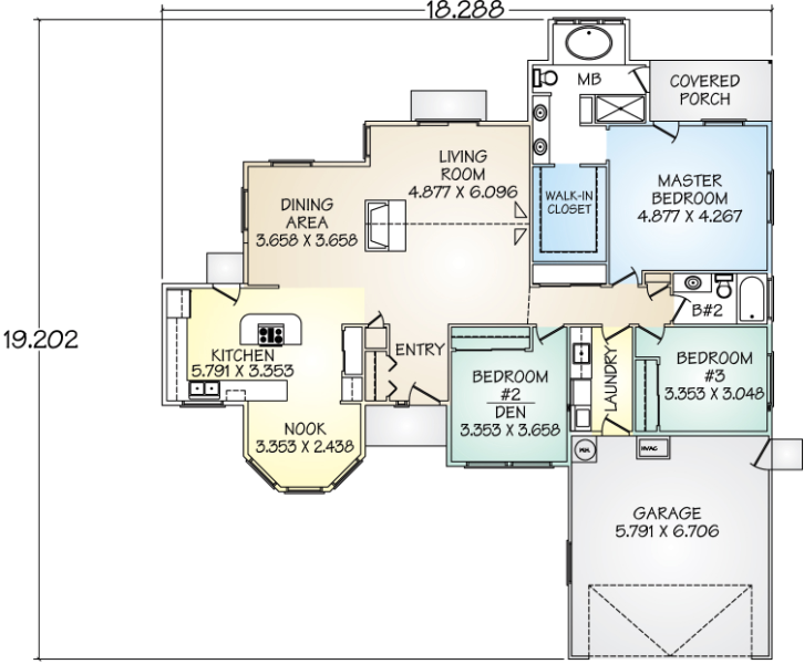 The Olympa panelized kit home is a flexible, open-style design. This plan features an interior laundry room, separate dining and breakfast nook, and a front bedroom that could serve as a den opening off of the entry. There are ample storage areas, especially for linens, and a large master bedroom walk-in closet. The master bathroom has both a large tub and a separate shower.