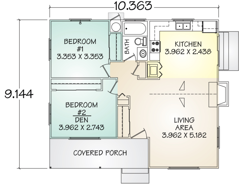 This plan is designed to be the perfect cabin for those weekend or vacation retreats. Unlike many small homes, the Portola panelized kit home provides interior space for all utilities, including a stacked clothes washer and dryer. The living, dining, and kitchen areas feature a vaulted ceiling and an alcove for a wood stove.