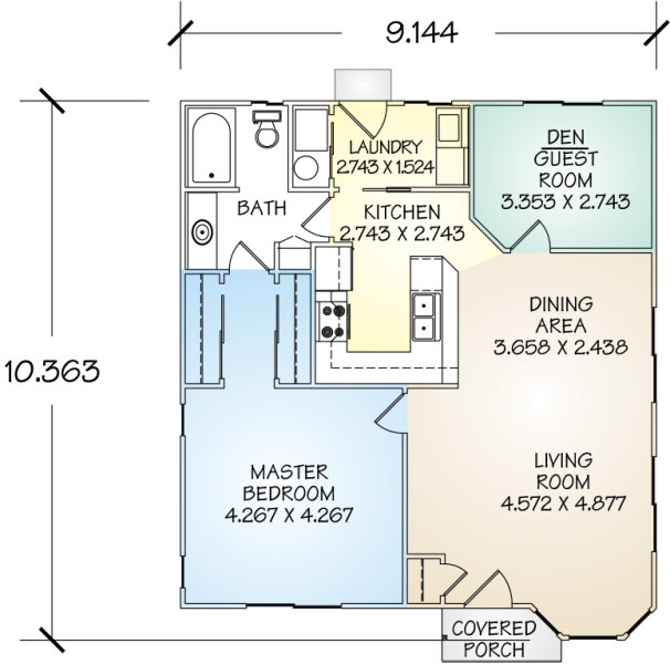 Designed to work well as a mountain retreat or detached in-law unit, the Lake View panelized kit home offers many conveniences normally found in larger homes. The den can easily be converted into a second bedroom, while space for a closet can be taken from the large laundry room or an armoire can be used. This plan also features a large kitchen and compartmentalized bathroom.