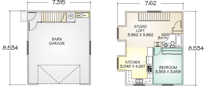 The Austin panelized kit home is an updated, livable version of our El Grande barn. A fully-designed, 650 square-foot loft area has a complete kitchen, living room, single bedroom, and bath. Downstairs, the two-car garage has room for storage as well as utilities.